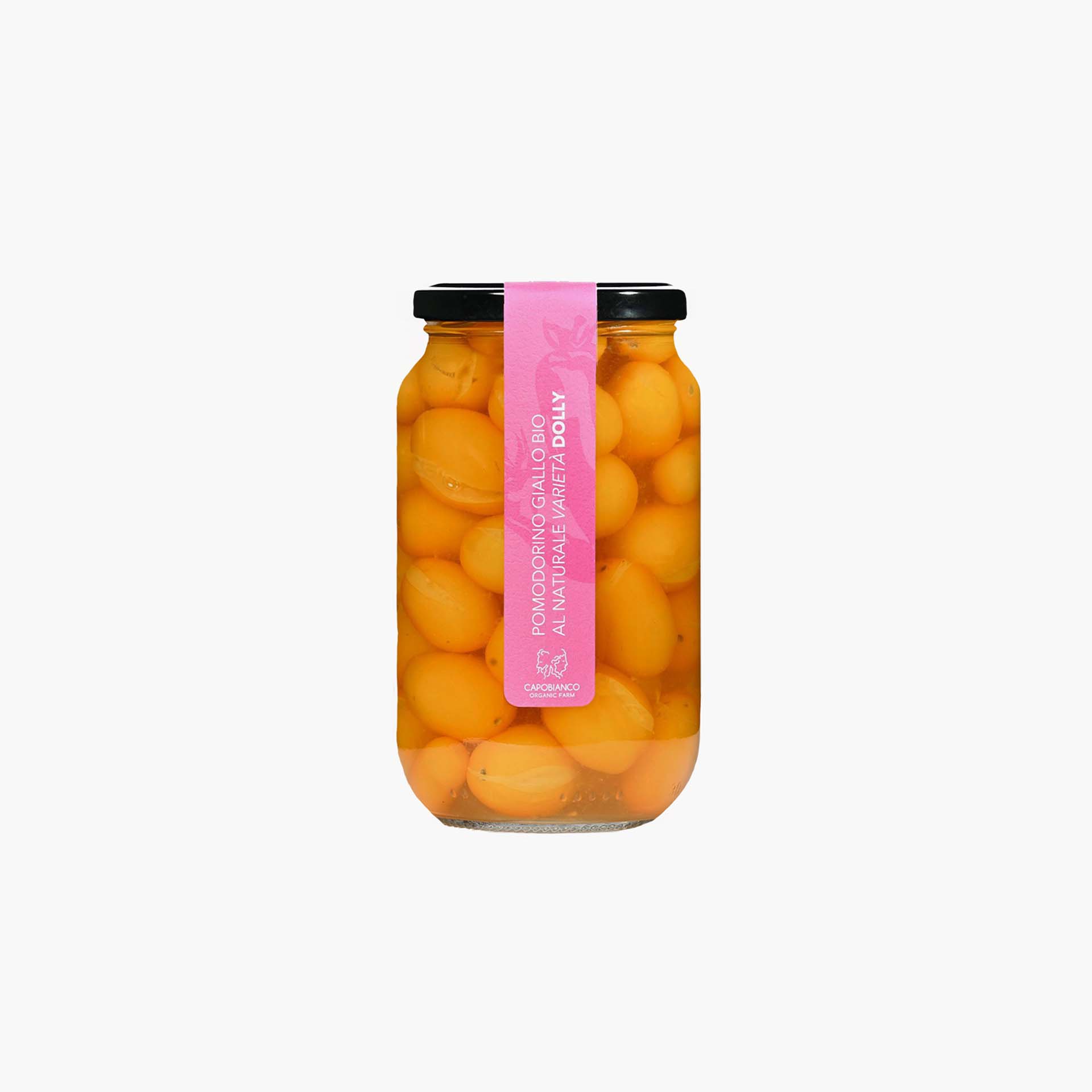 Håndplukkede gule tomater i fuld modenhed, vasket og pakket med vand og salt i glas. De er tilspidsede, med en tynd hud og blød tekstur. De er duftende med forskellige noter af aromaer og en interessant kontrast mellem sødme og syre. Med en delikat smag. Uden farvestoffer eller konserveringsmidler.